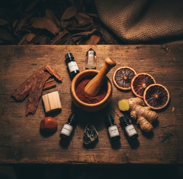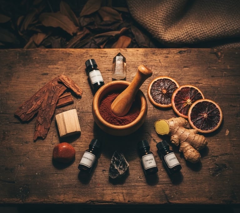 Botanical Alchemy: Deep red and earthy ochre swirls to represent dancing flames; a dusting of dried botanicals for texture.