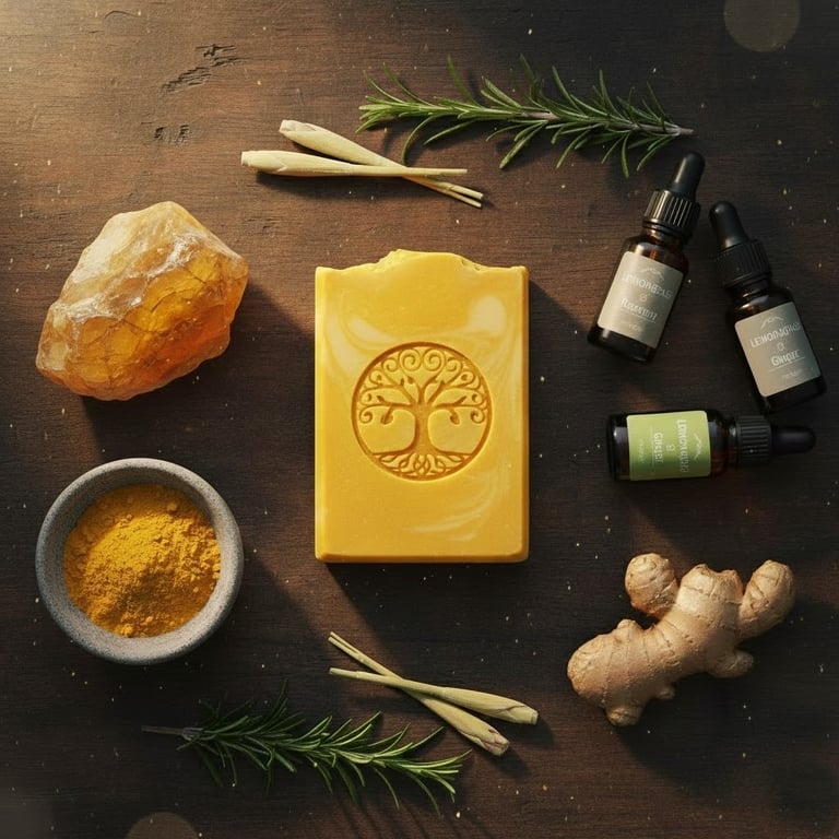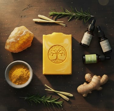 The Ingredients: Olive Oil, Rice Bran Oil, Coconut Oil, Shea Butter, Avocado Oil, Castor Oil, Yellow Brazilian Clay, White Kaolin Clay, Turmeric Paste, Essential Oils of Lemongrass, Rosemary & Patchouli, Sodium Hydroxide, Distilled Water & Sodium Lactate. Dried Chamomile flowers.